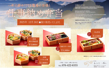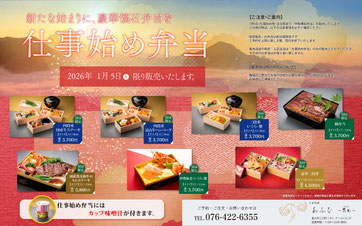 2025/10/22 仕事納め・仕事始めのお弁当、ご予約承っております。 毎年ご好評をいただいております、仕事納め・仕事始め用のお弁当を承っております。 年末年始の節目に、職場の皆様でほっと一息つけるお食事としてぜひご利用ください。 なお、当該両日は本商品限定での販売となり、通常のお弁当および他メニューのご用意はございません。 tagPlaceholderカテゴリ: